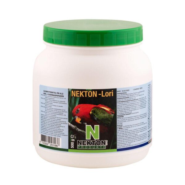 NEKTON-Lori er et balansert fullfôr for alle papegøyearter som i stor grad lever av naturlig flytende føde i form av blomsternektar, plantesaft og pollen. Sammensetningen av NEKTON-Loris ingredienser av høyeste kvalitet er strengt orientert mot naturlige parametere. I tillegg tar NEKTON-Lori hensyn til den spesielle strukturen i fordøyelsessystemet til disse fuglene, nedbrutt proteiner (aminosyrer) og fokuserer på direkte tilgjengelighet av lett fordøyelige karbohydrater. En optimal blanding er resultatet av over 100 individuelle komponenter supplert med spesifikke fettsyrer og beriket med alle viktige stoffer (vitaminer, sporstoffer) samt mineraler og hovedelementer. Ingen andre feeds trenger å gis. Ingen andre vitaminforbindelser skal gis mens NEKTON-Lori gis.